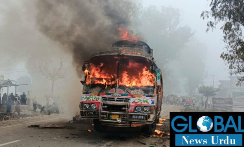 تیز رفتار بس نے نوجوان کو کچل دیا، ورثاء کا احتجاج، مظاہرین نے بس کو آگ لگا دی