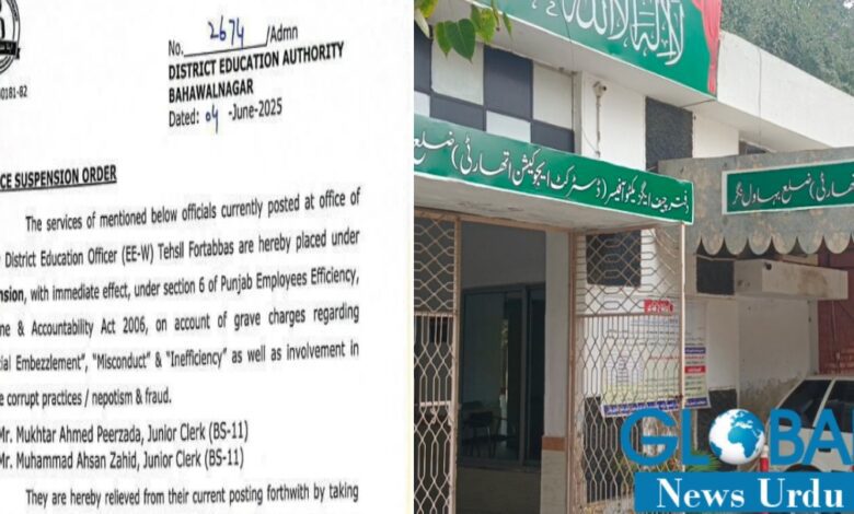 سی ای او ایجوکیشن اتھارٹی بہاولنگر کا کرپشن مافیا پر کاری وار، مالی بدعنوانی، نااہلی، اقربا پروری اور فراڈ کے الزامات پر نیب کے سابق ملزم سمیت دو بااثر کلرک معطل، پیڈا ایکٹ کے تحت انکوائری کا حکم جاری۔
