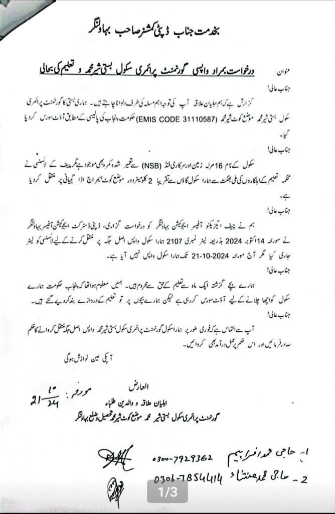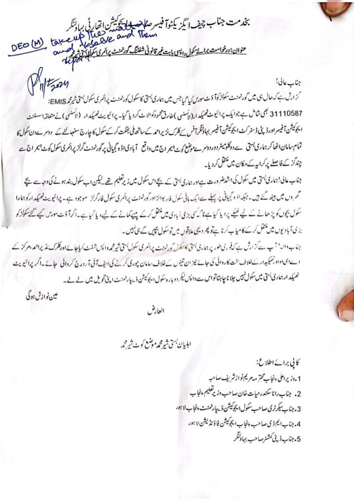 انہوں نے بتایا کہ ہماری درخواستوں کے بعد ایجوکیشن اتھارٹی کے انچارج سی ای او اجمل نثار نے ہمارے ساتھ وعدہ کیا کہ دو دن کے اندر سکول واپس بستی شیر محمد میں شفٹ ہو جائے گا۔