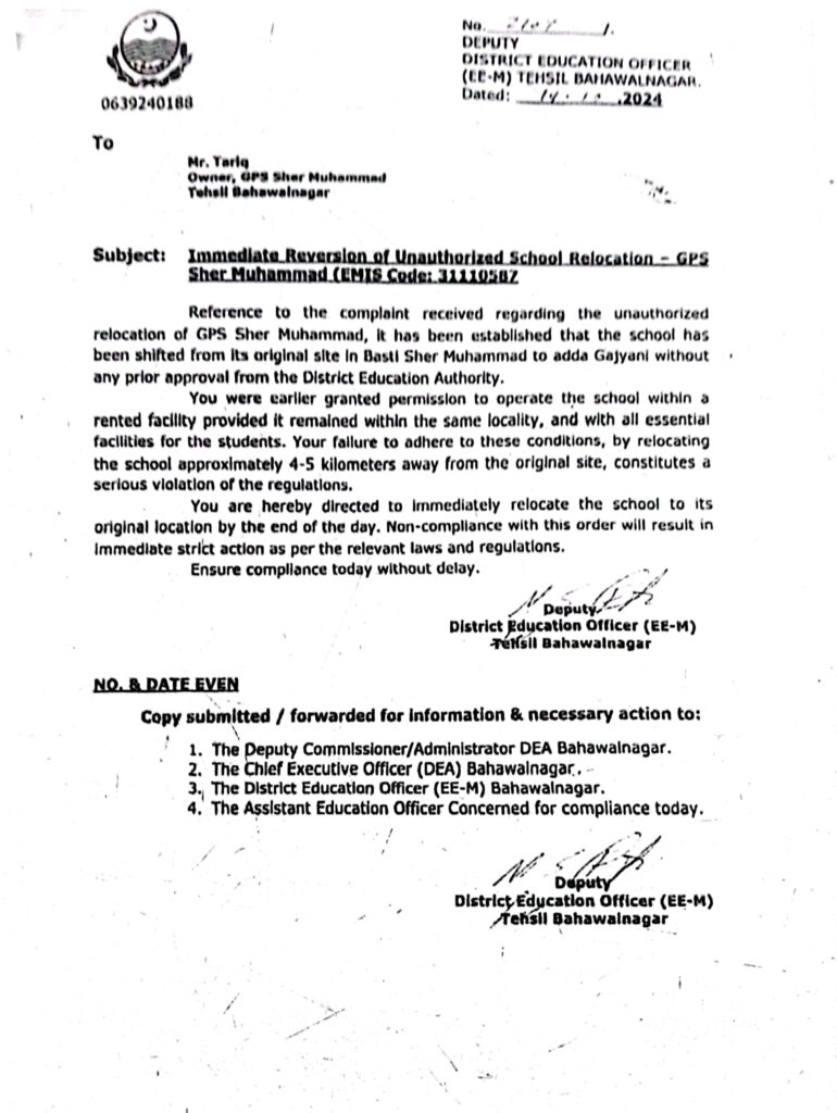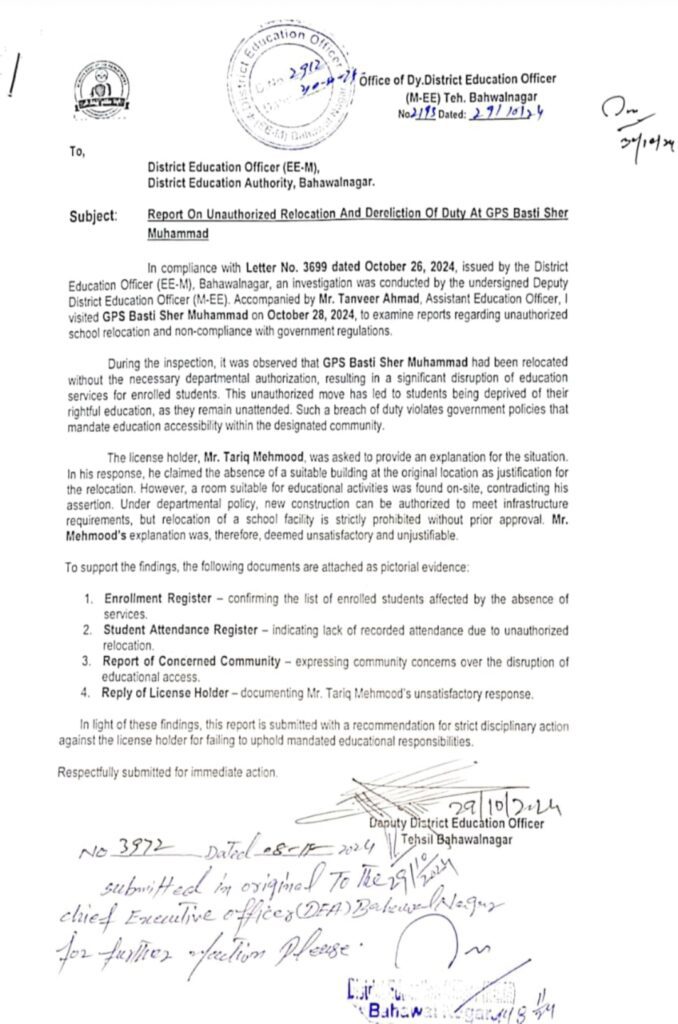 مگر یہ وعدہ وفا نا ہو سکا البتہ ڈپٹی ڈسٹرکٹ ایجوکیشن آفیسر بہاولنگر ہمارے گاؤں میں آئے اور ہمارے بیان ریکارڈ کر کے لے گئے۔ ڈپٹی ڈسٹرکٹ ایجوکیشن آفیسر نے ڈسٹرکٹ ایجوکیشن آفیسر ایلیمنٹری کو رپورٹ بھیج دی کہ سکول غیر قانونی طور پر شفٹ کیا گیا ہے اور سکول شفٹ ہونے سے سکول میں زیر تعلیم بچے تعلیم سے محروم ہو گئے ہیں۔ سکول فوری طور پر واپس کیا جائے مگر تاحال اس رپورٹ پر عمل درآمد نہیں ہوا۔