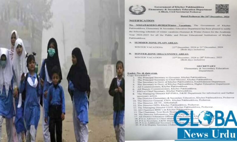 پشاور (ویب ڈیسک) موسم سرما کی تعطیلات کا اعلان۔ تفصیلات کے مطابق محکمہ تعلیم خیبر پختونخواہ نے موسم سرما کی تعطیلات کا نوٹیفکیشن جاری کردیا۔ نوٹیفکیشن کے مطابق سمر زون میں 22 دسمبر سے 31 دسمبرتک تعلیمی اداروں میں چھٹیاں ہوں گی جبکہ ونٹر زون میں 22 دسمبر سے 28 فروری تک موسم سرما کی تعطیلات ہونگی.
