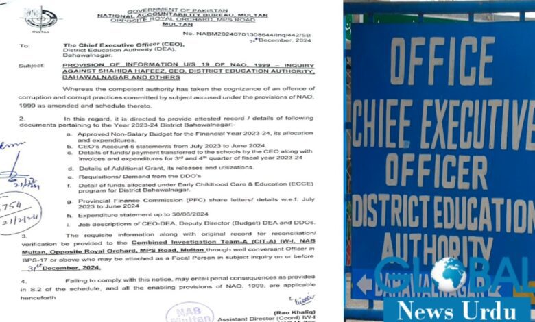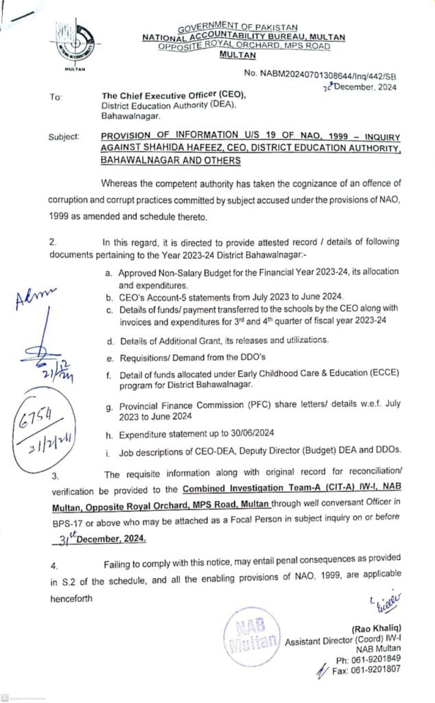 نیب نے سی ای او ایجوکیشن اتھارٹی بہاولنگر کو لیٹر لکھ کر مالی سال 2023-24 کے ریکارڈ کی تصدیق شدہ کاپیاں طلب کر لیں۔