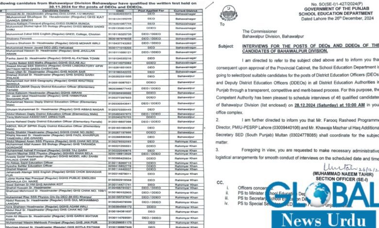 حکومت پنجاب نے ڈسٹرکٹ ایجوکیشن آفیسرز اور ڈپٹی ڈسٹرکٹ ایجوکیشن آفیسرز کی تعیناتی کا ٹیسٹ پاس کرنے والے امیدواروں کے انٹرویو کا شیڈول جاری کر دیا