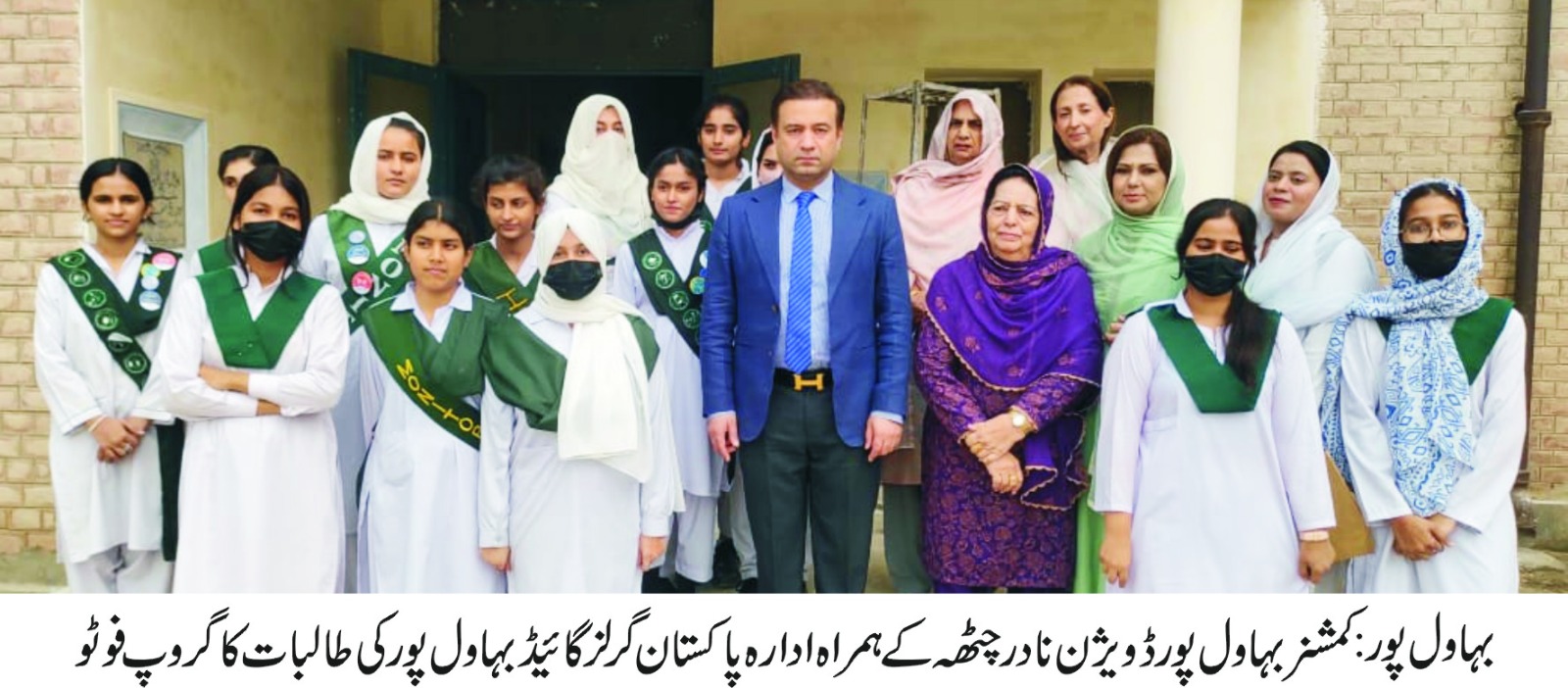 بہاولپور ( بیورو رپورٹ) گرلز گائیڈ کی تربیت طالبات کی سماجی اور فکری رہنمائی کا ذریعہ ہے۔ کمشنر نادر چٹھہ۔ تفصیلات کے مطابق کمشنر بہاول پور ڈویژن نادر چٹھہ نے ادارہ پاکستان گرلز گائیڈ بہاول پور کا دورہ کیا۔ انہوں نے اظہار خیال کرتے ہوئے کہا کہ گرلز گائیڈ کی تربیت طالبات کو مستقبل کے چیلنجز سے نبرد آزما ہونے کے لیے بھرپور معاونت کرتی ہے۔ انہوں نے کہا کہ گرلز گائیڈ کی تربیت طالبات کی سماجی و فکری رہنمائی کا ذریعہ ہے۔ اس موقع پر ڈویژنل کمشنر گرلز گائیڈ میڈم پروین مسعود بھٹی نے ادارہ گرلز گائیڈ کے تحت جاری سرگرمیوں اور درپیش مسائل بارے آگاہ کیا۔ کمشنر بہاول پور نے متعلقہ محکموں کے افسران کو ادارہ گرلز گائیڈ بہاول پور کی عمارت کی مرمت و بحالی، سبزہ زار و عمارت کی تزئین و آرائش بارے احکامات جاری کیے۔