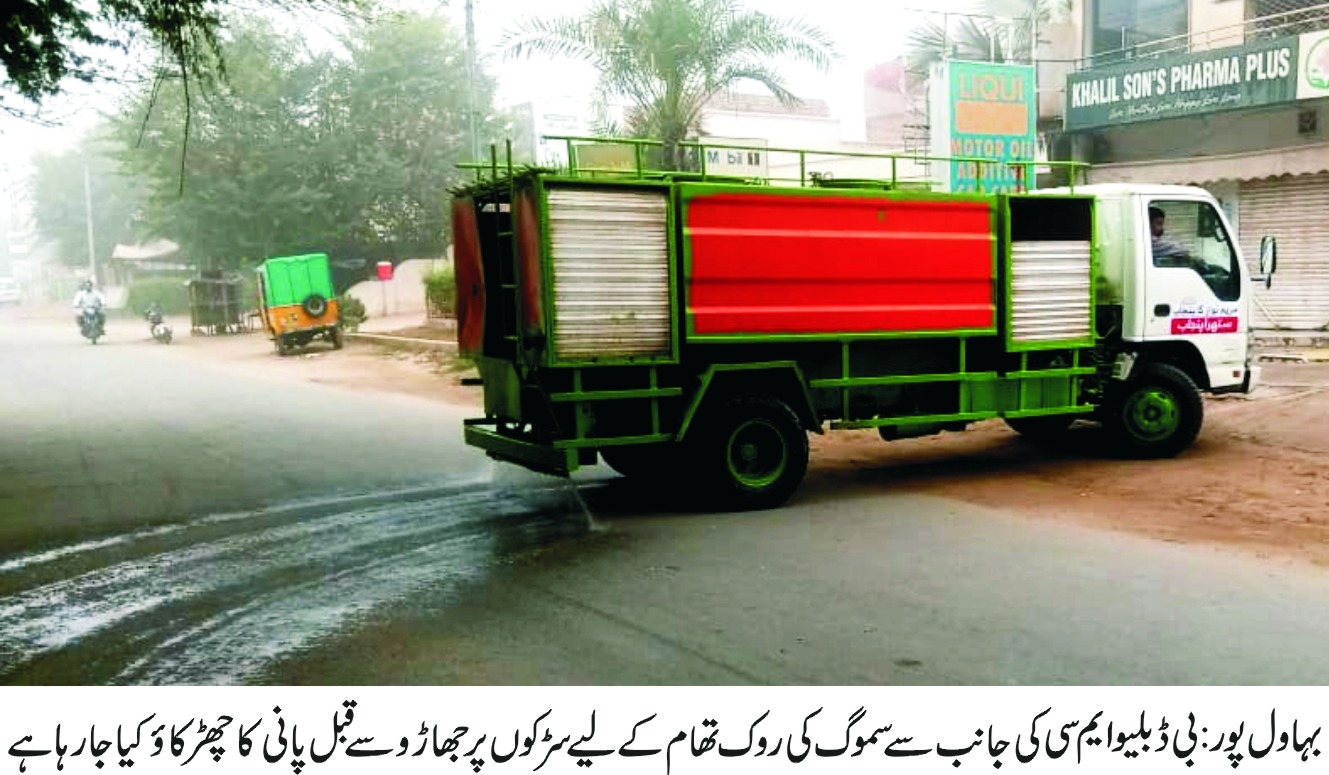 سموگ کی روک تھام کے لیے بہاول پور میں سڑکوں پر صفائی سے قبل پانی کا چھڑکاؤ